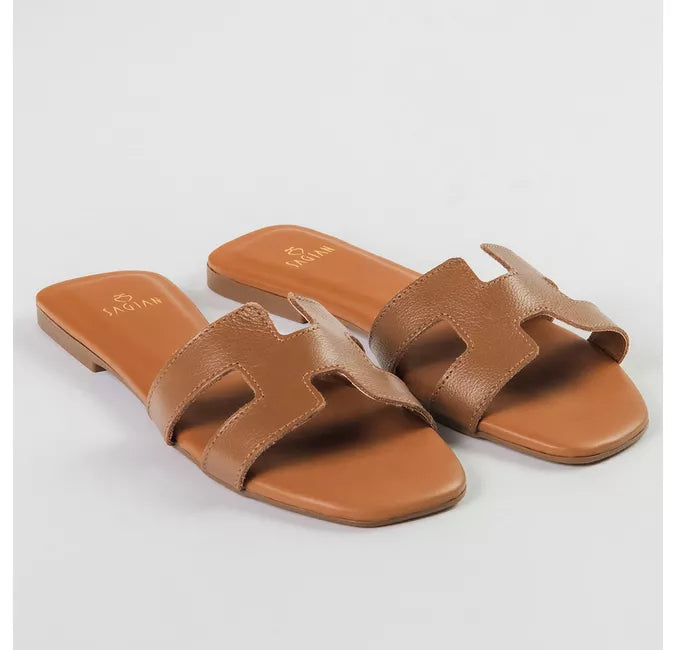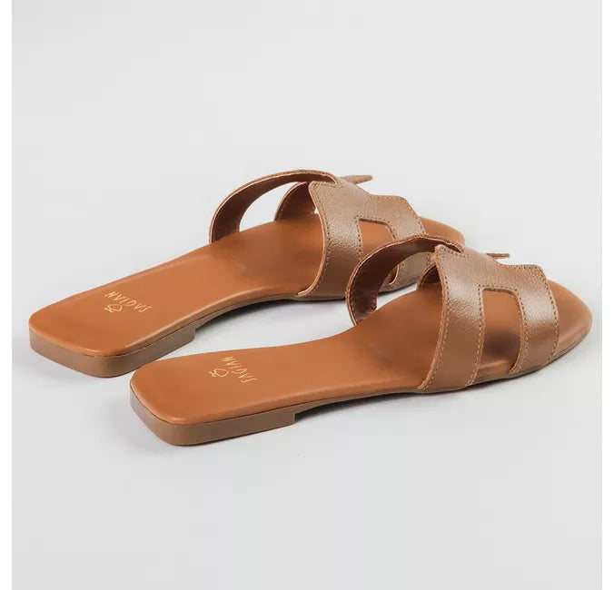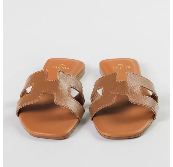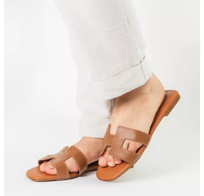 Sandália Rasteira Feminina Katarina em Couro Caramelo